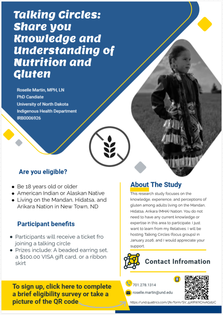 If you’re American Indian or Alaskan Native, 18 years old or older, and live in MHA Native, you are eligible to participate in this study about nutrition and gluten. PhD Candidate, Roselle Martin, in UND’s Indigenous Health Department is conducting the study and is recruiting participants for the Talking Circles. Please sign up using this link: https://und.qualtrics.com/jfe/form/SV_51KRWXCnvAGst2C